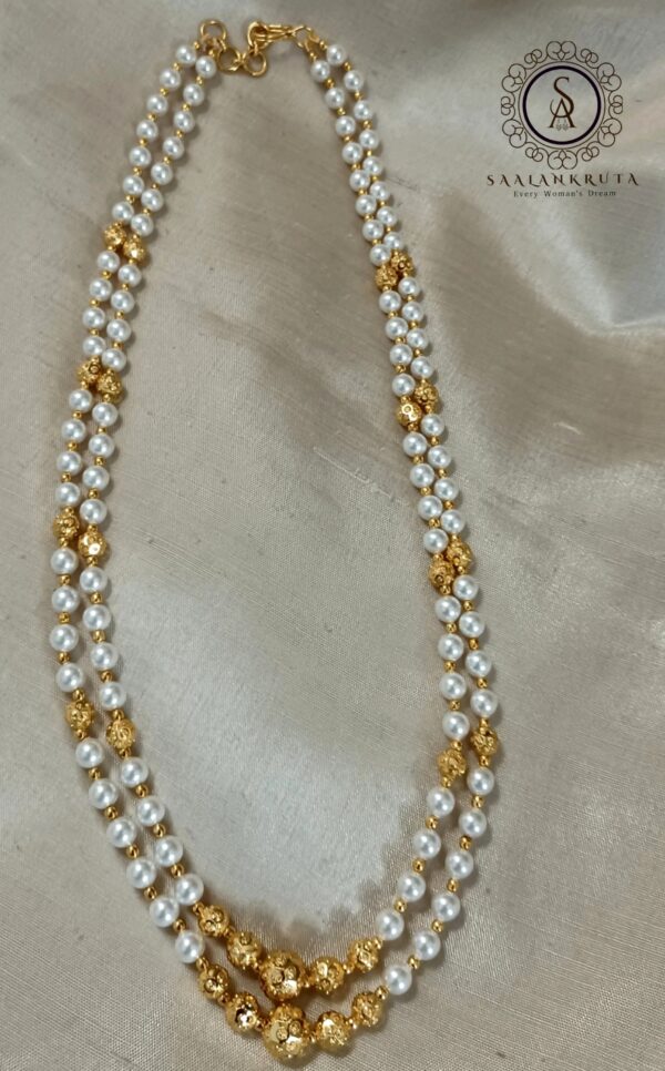 4mm full white pearl with gold platted beads ,it is a hand made two layer step s jewellery with long durabality